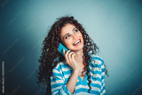 Happy woman at phone. Portrait of a funny girl taking a phone conversation looking up daydreaming isolated on blue background