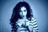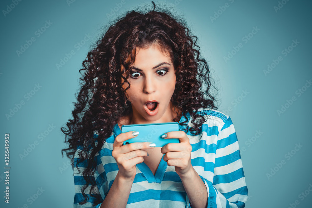 Shocked look at phone. Closeup portrait surprised young girl looking at phone seeing bad news or photos with stunned emotion on face open mouth isolated blue wall background. Human expression