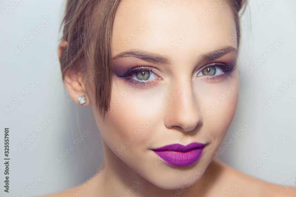 Beautiful smile girl woman face. Perfect skin, isolated light gray white background.