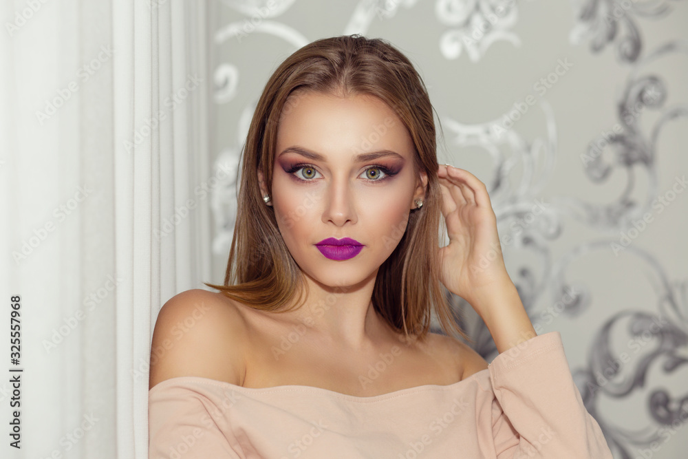 Beautiful and confident. Pretty teenage girl hand adjusting hair looking at you camera at home. Neutral face expression.