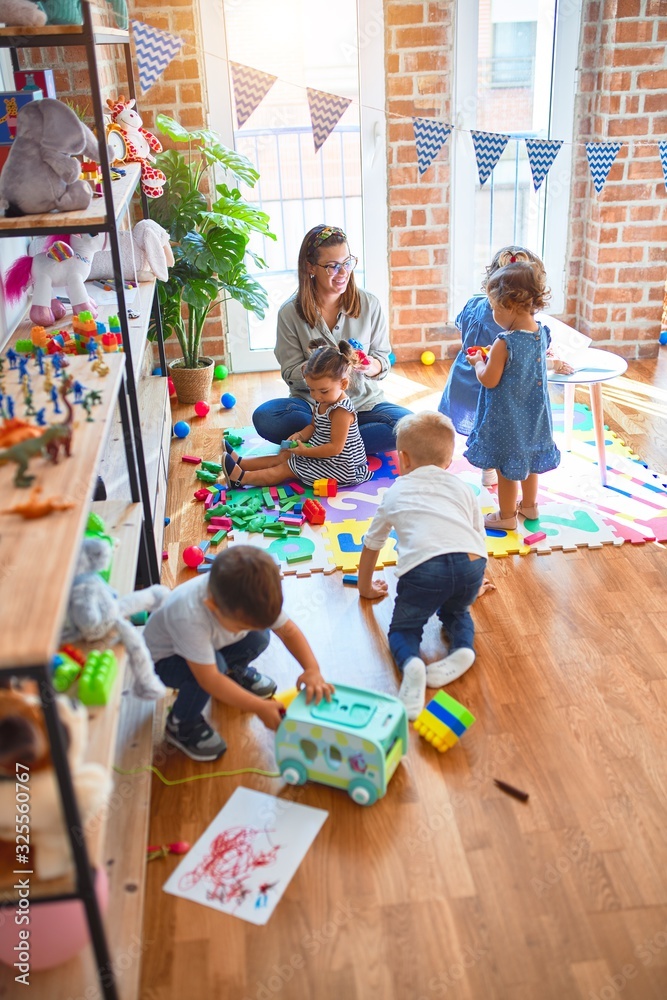 Beautiful teacher and group of toddlers playing around lots of toys at kindergarten