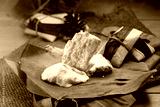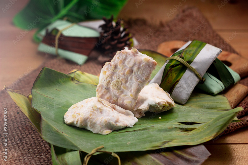 Tempe: raw tempeh (uncooked soybean cake) on banana leaf .