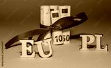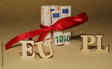 Word EU and PL made of wooden letetrs close up behind and between them banknotes of 50 and 10 euro rolled in rolls and tied with red ribbon, bow in soft focus, light background with dark shade