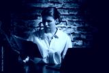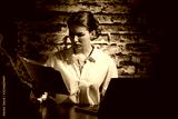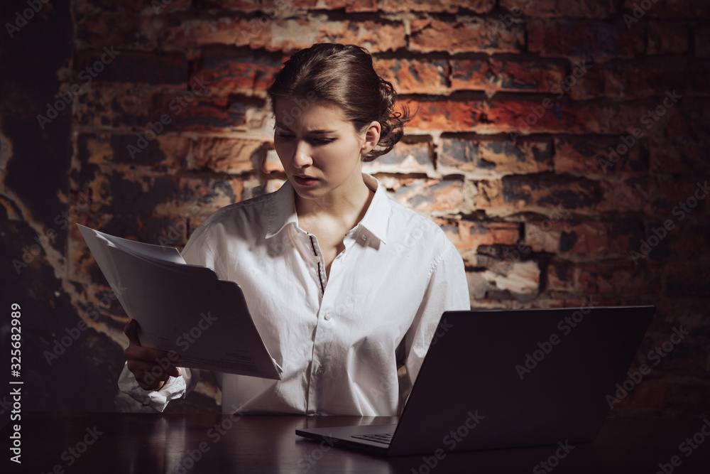 Concentrated young female lawyer sitting at table with laptop and reading contract confused and dissatisfied with some terms