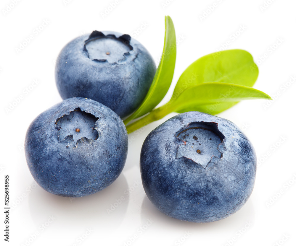Berry blueberry with leaf mint close-up. Fruity still life for organic healthy food, isolated on white background.