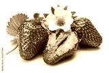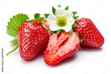 Strawberries with green leaf and flowers, isolated on white background.