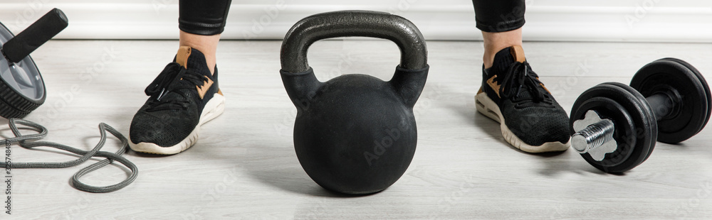 panoramic shot of sportswoman with kettlebell and sports stuff standing at home
