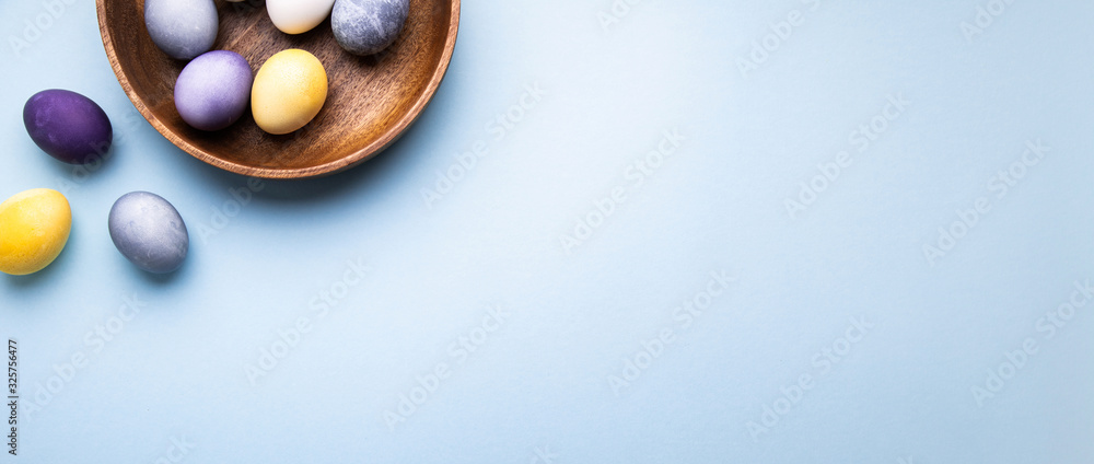 Naturally colorful dyed Easter eggs on blue background. Happy Easter holiday theme, banner