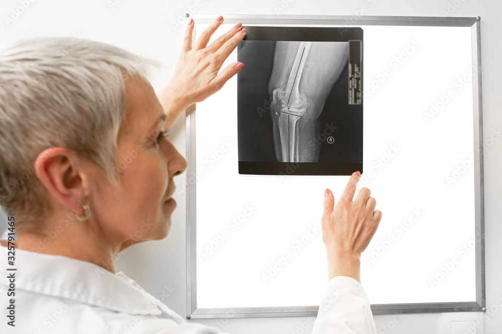 Radiologist examined a knee x-ray on a negatoscope. Doctor sees a bruised leg in an x-ray photograph