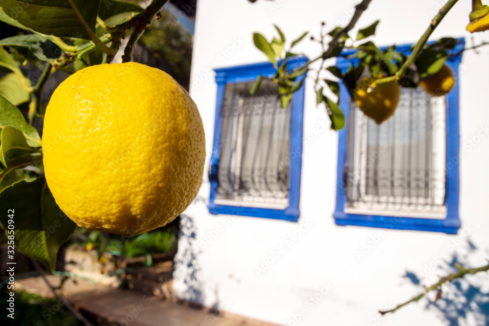 Fresh lemons on tree in a home garden.