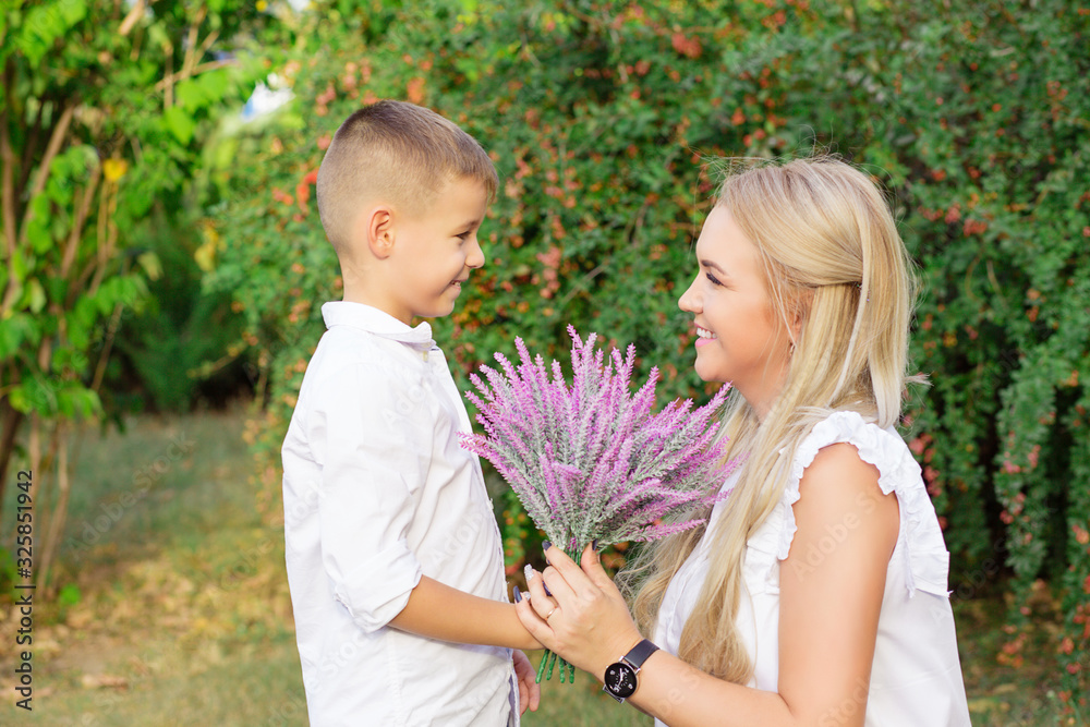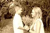 Happy mothers day. Son giving flowers to mom outside isolated green foliage background