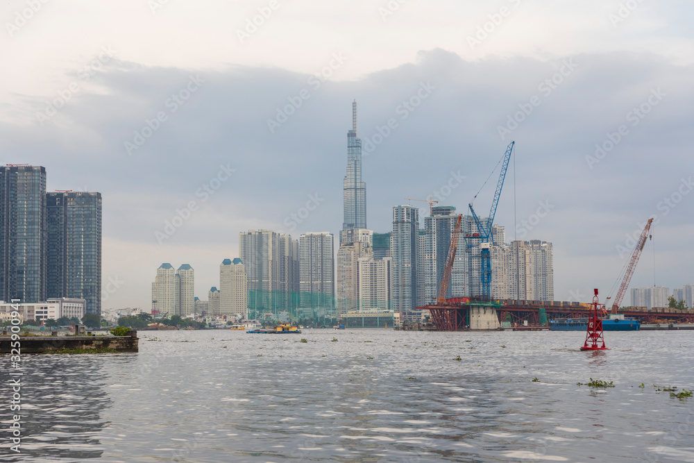 Panoramic view of Ho Chi Minh city with Sai Gon river in Vietnam.