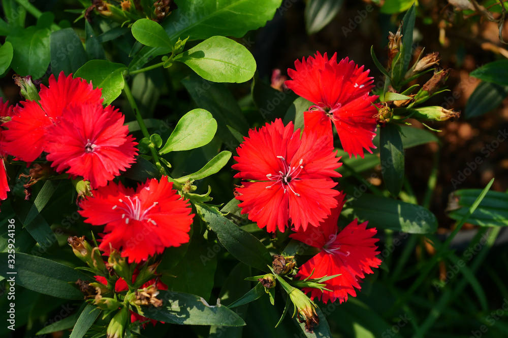 Dianthus barbatus blossom with green leaves in background, Red petals and white stamens of flowers in Thailand