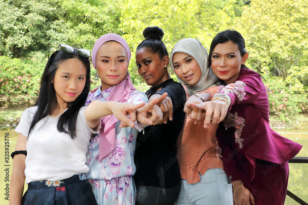 group of five woman friends Malay Chinese Indian Asian Malaysian outdoor green park lake nature pointing finger at you towards camera
