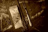 Piece of red fish fillet with spices on black slate board with vintage cutlery