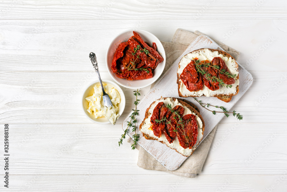 Healthy sandwiches with soft cheese and spicy sun-dried tomatoes