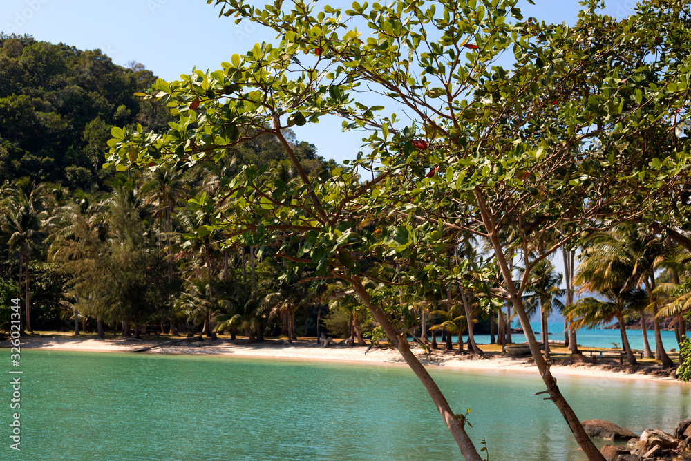 Tropical island beach with coconut palm trees. Sand spit in the sea.