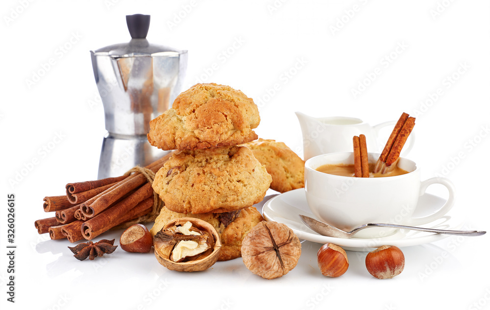 Homemade cookie with coffee and spice. Still life with sweetness baking and hot drink. Isolated on white background.