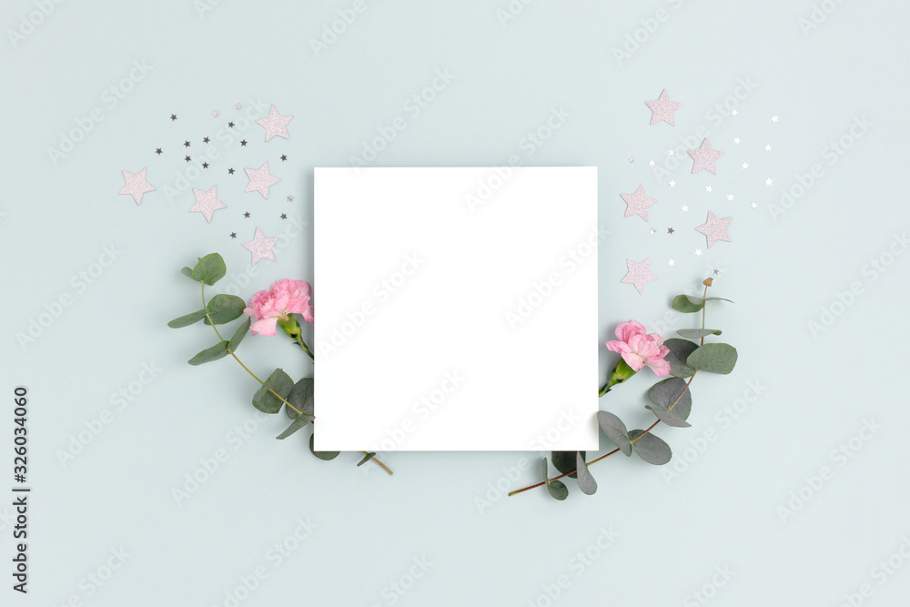 Greeting card mockup with carnation flowers, eucalyptus and stars confetti. Festive concept with place for text on a blue pastel background.