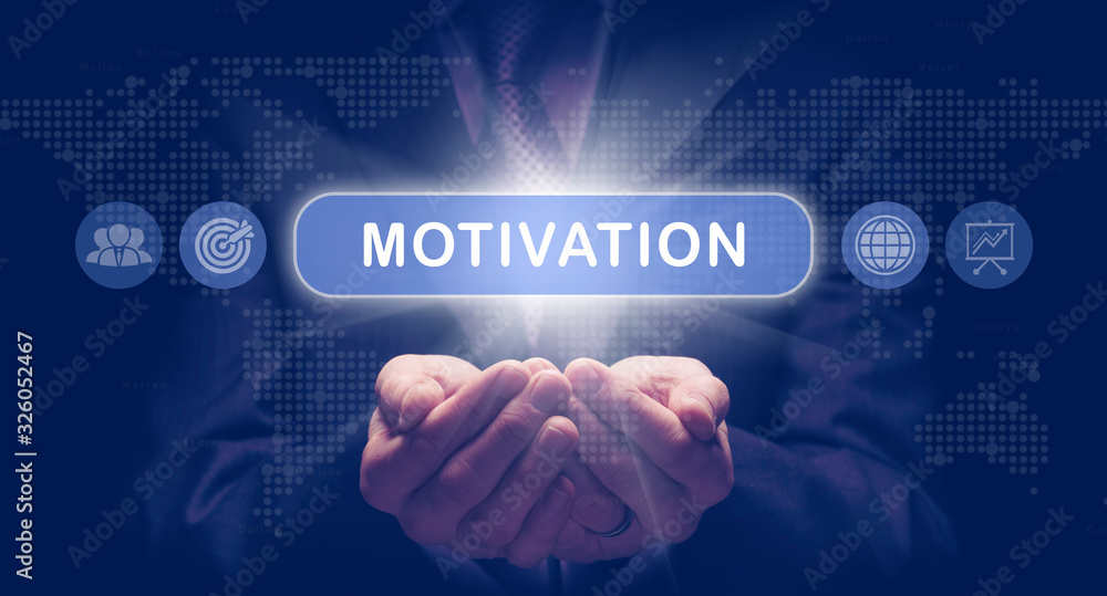Businessmans cupped hands holding an Motivation business concept on a computerised display.