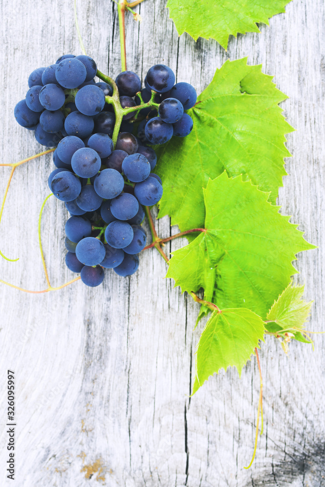 Blue grapes with leaves on an old rough wooden background, top view, copy space