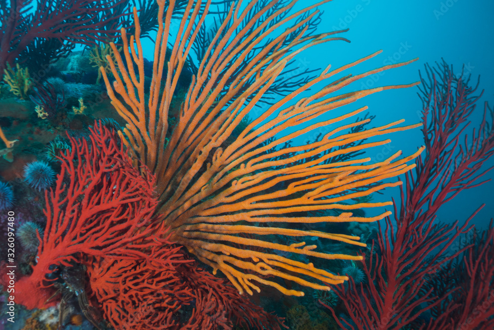 Large orange Flagellar sea fan or Whip fan (Eunicella albicans) surrounded by various other species.