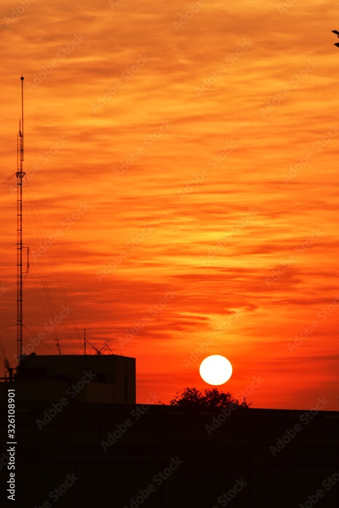 Wireless telephone pole and orange-yellow sky In the early morning of the day