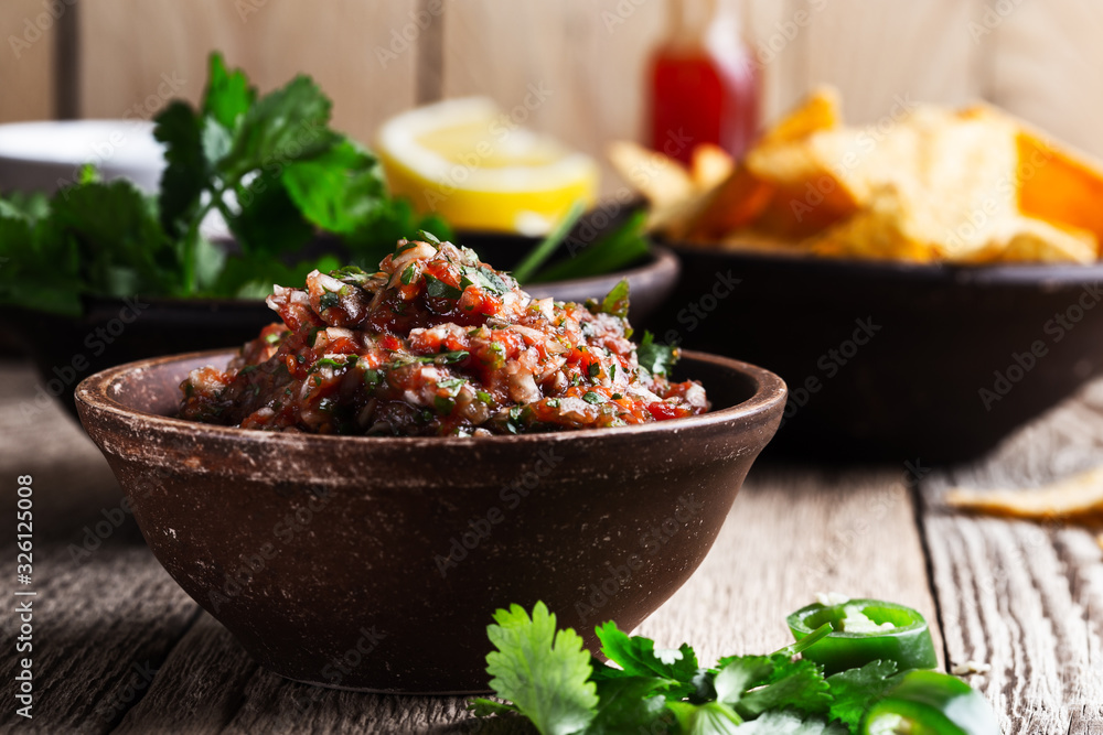 Homemade salsa and tortilla chips, favorite Mexican appetizer snack