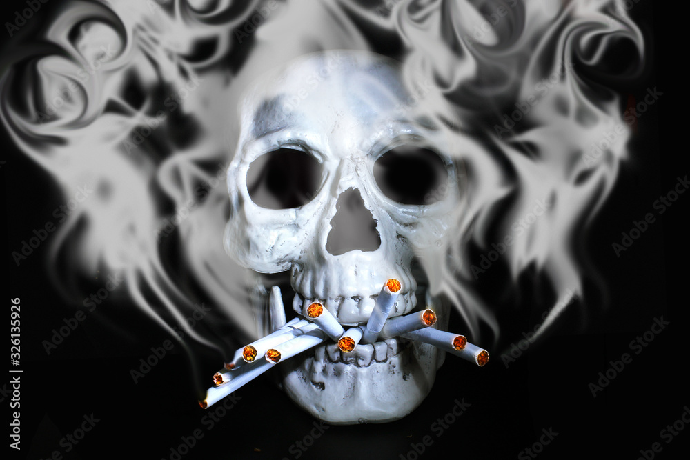 Human skull with several smoking cigarettes in his mouth on a black background. Symbol of the dangers of smoking.