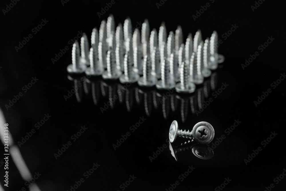 Chrome-plated screws on metal on a black mirror surface on the background of evenly lined rows of screws.