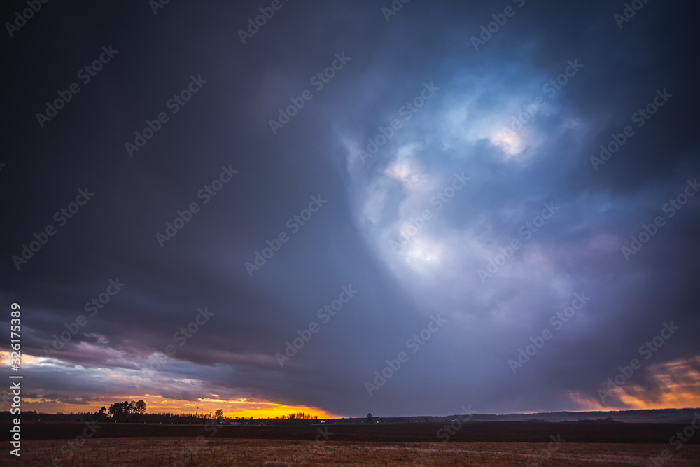 Rain falling from the sky in the evening light