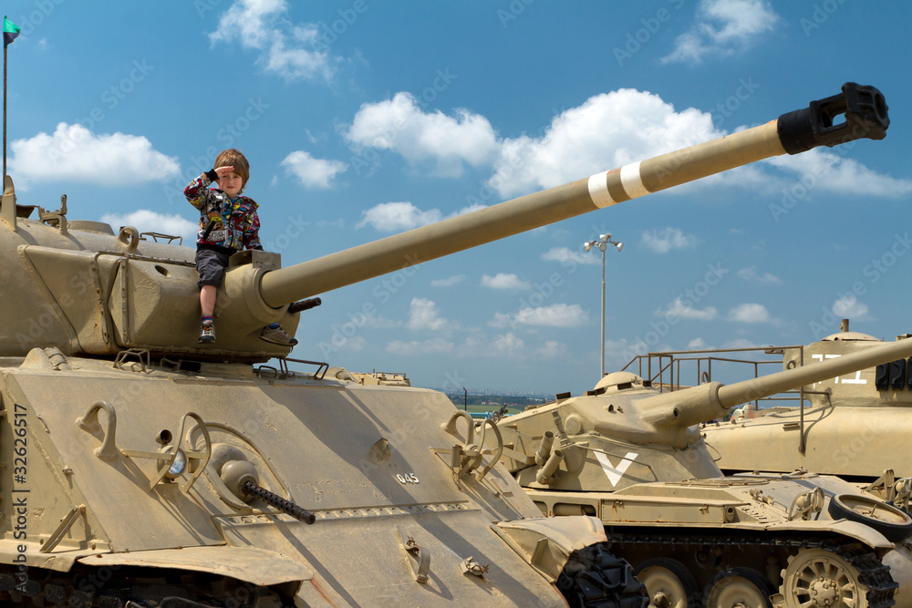 Cute boy saluting on the israeli tank. Museum of tanks. Israel.