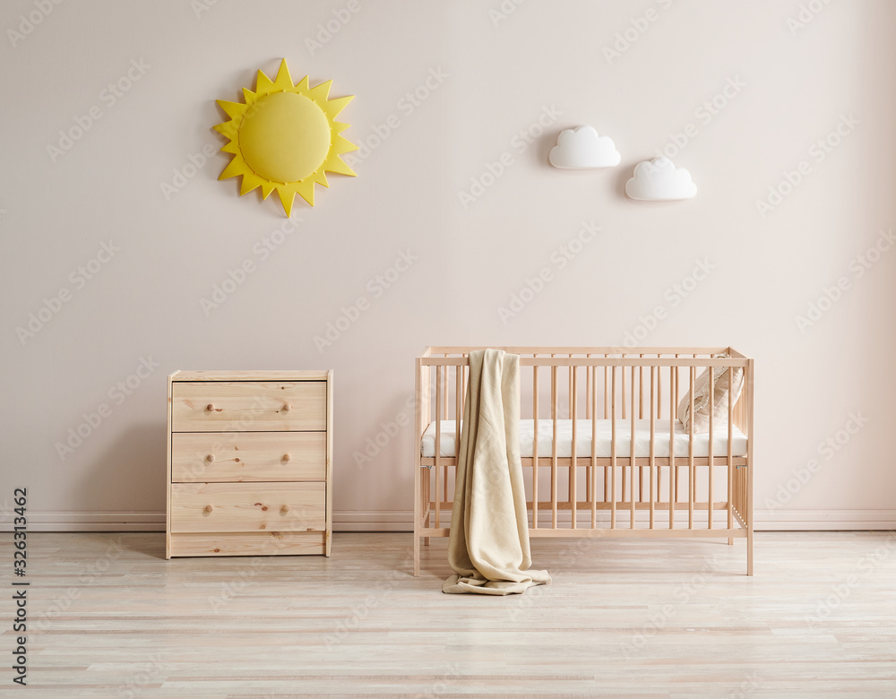 Modern wooden crib and baby room style, pink wall and cabinet decor.