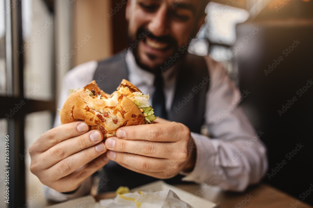Closeup of hungry man in suit sitting in fast food restaurant and eating cheese burger.