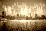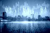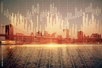Financial graph on night city scape with tall buildings background double exposure. Analysis concept.