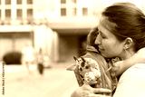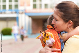 Women hugs her daughter near the school. girl does not want to leave her mother.