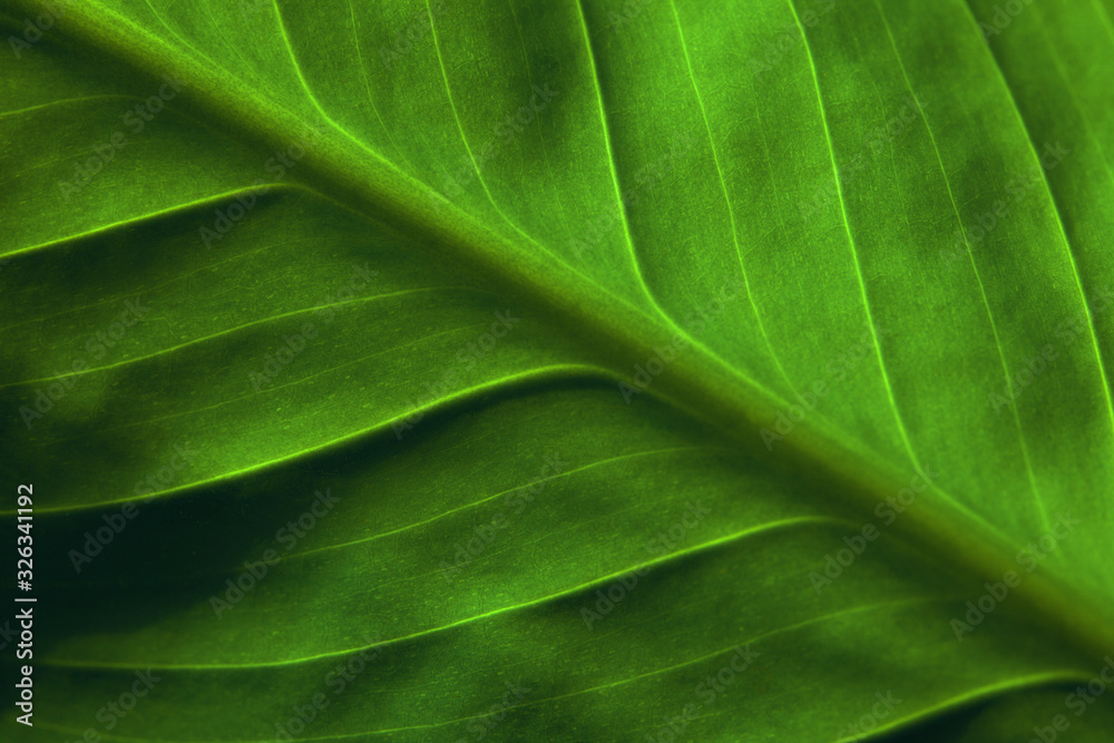 Natural background for Wallpaper. Bright green leaf of plant close up. Invoice.