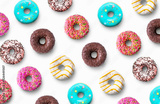 Delicious glazed donuts pattern on a white background. Top view. Flat lay.