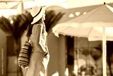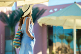 Young woman wearing light summer dress and yellow straw hat holding fashionable shoulder bag standing outside hotel on summer sunny day.