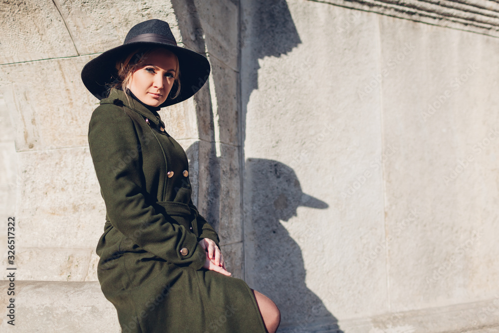 Portrait of stylish young woman in military coat, hat outdoors. Spring fashion female clothes accessories.