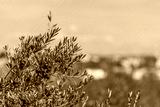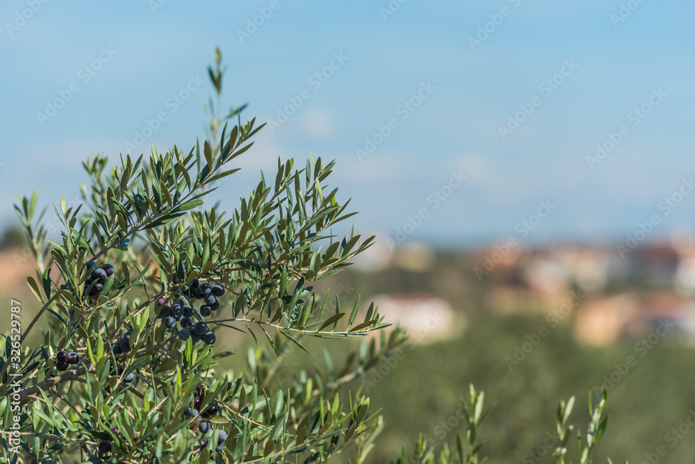 Olive branch on blurred background, Tarragona, Catalonia, Spain. With selective focus.