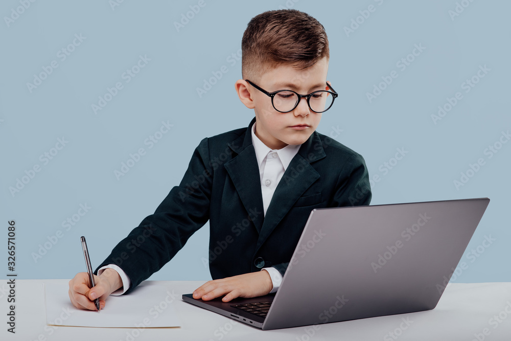 Young business little boy, in glasses and suit reading data from laptop and making notes while sitting at table and working against blue background