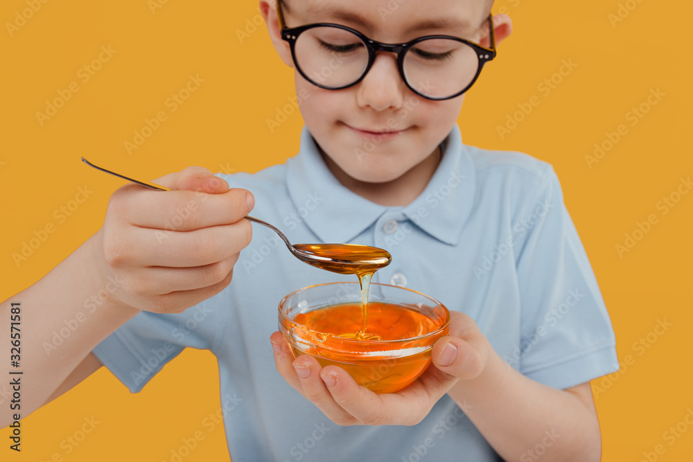 cropped, Adorable boy in glasses smiling while enjoying healthy sweet honey against yellow background