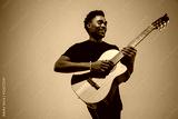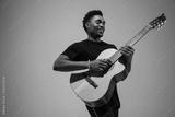 Young and joyful african-american musician playing guitar and singing on gradient orange-yellow studio background in neon light. Concept of music, hobby, festival. Colorful portrait of modern artist.