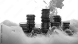 rows of coin money and ink motion in black and white style for business , finance , economy and banking concept background