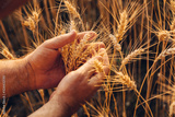 Man hands holding ripening ears of wheat. Harvest and food concept.