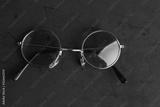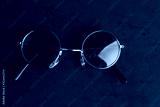 glasses with round crystals on colored background