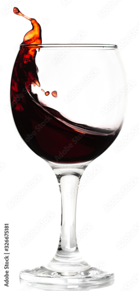 Wineglass with wine red juice beverage splashing wave isolated on white background