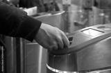 A woman’s hand with a wedding ring on her finger applies a ticket to the yellow circle of an automatic subway system in Moscow. The yellow circle is a sensor of subway access system. Translation: pass