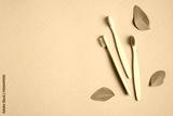 Eco-friendly bamboo toothbrushes and green leaves on brown background. Flat lay, top view. Zero waste, plastic free concept. Sustainable lifestyle.